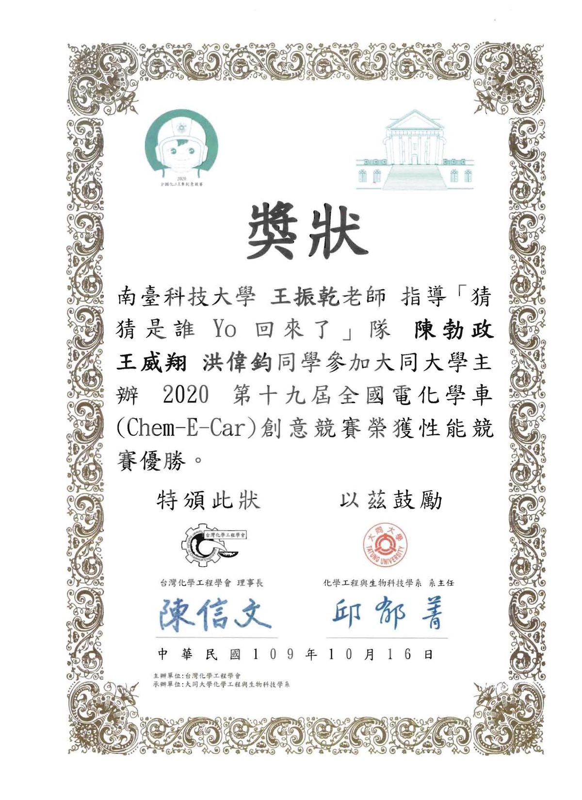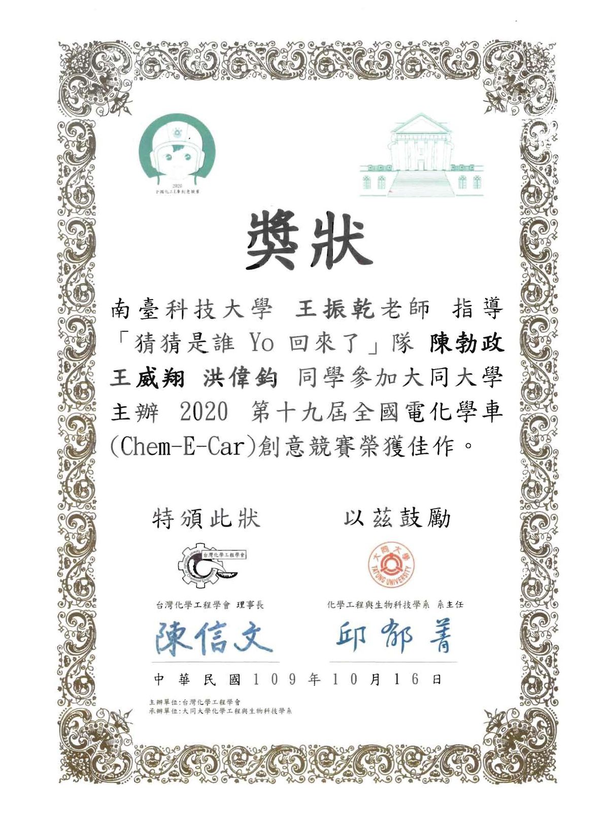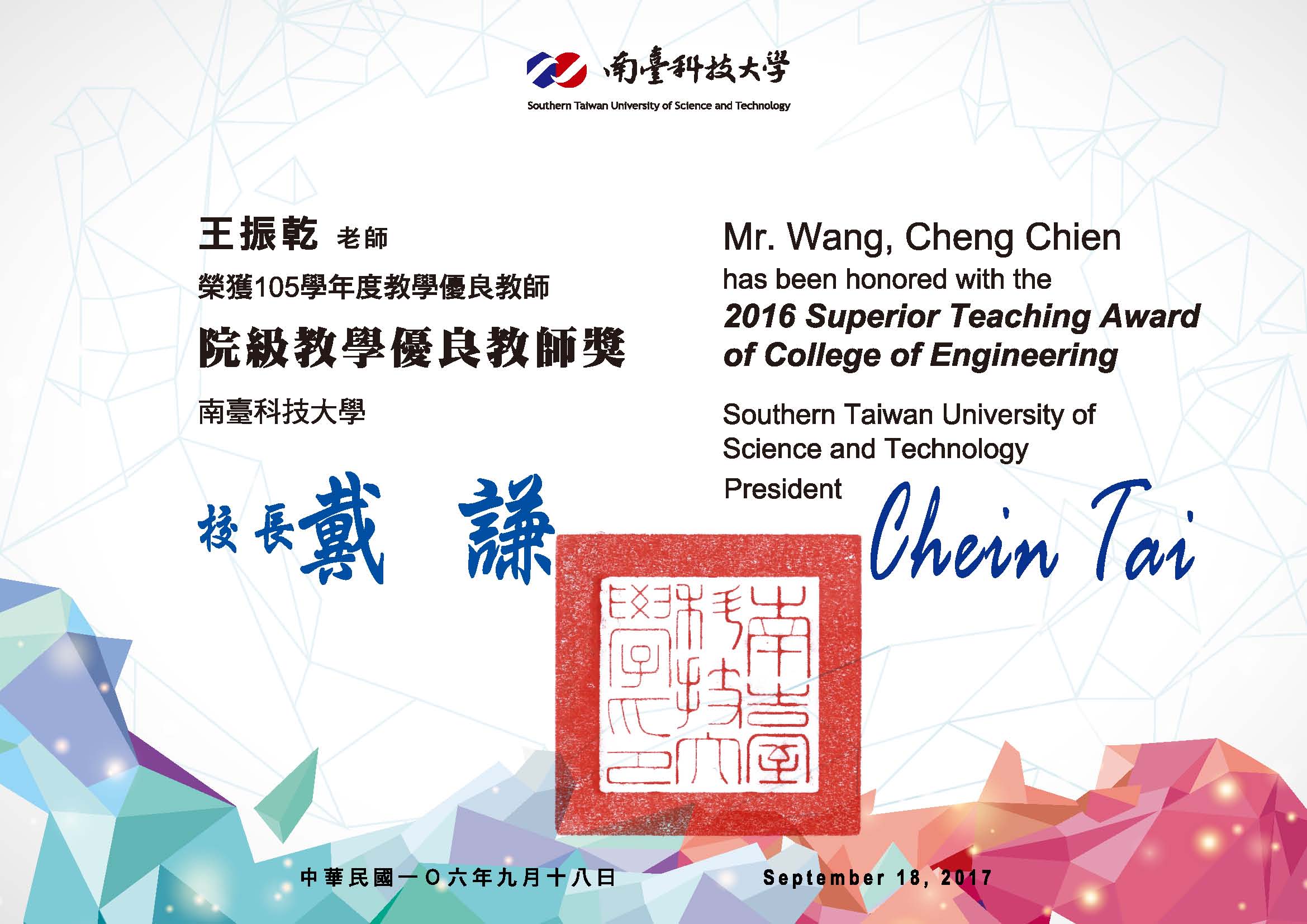 位置: 王振乾 > 職涯檔案 > 獲獎榮譽