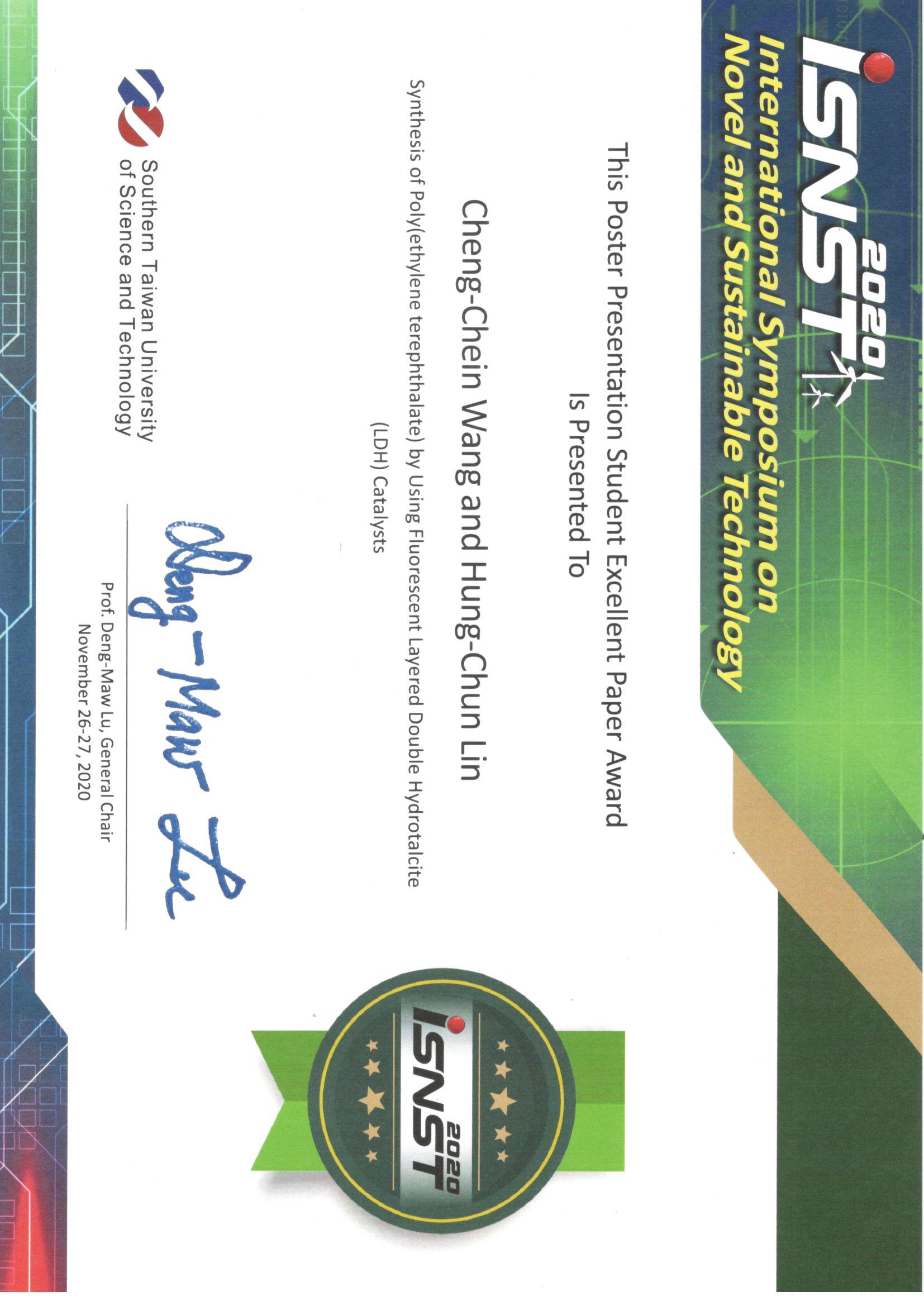10. 2020 ISNST International Symposium on Novel and Sustainable Technology, Excellent Presentation Award (2)