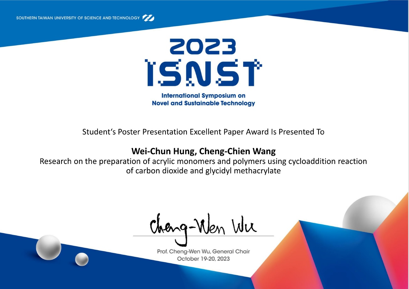 15. 2019 ISNST( International Symposium on Novel and Sustainable Technology)國際研討會論文佳作奬