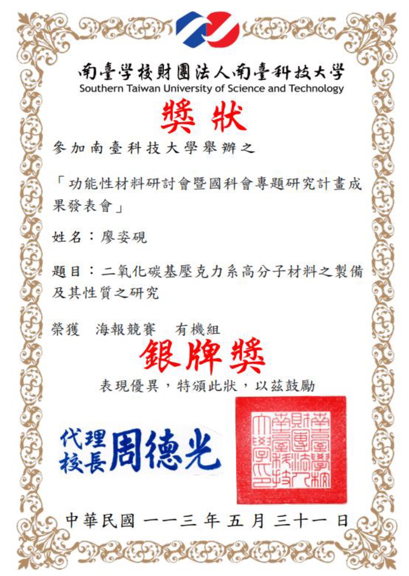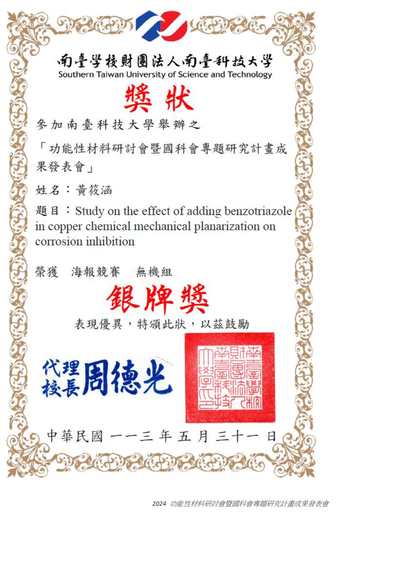 4. 2024 功能性材料研討會暨國科會專題研究計畫成果發表會與新工程教育專題論壇/無機材料組/銀牌奬