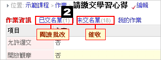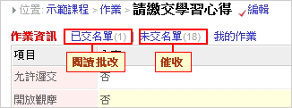 作業於新增後,若已繳交作業同學可進行 [閱讀、批改作業] ,未繳交可進行 [催收]。