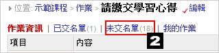 2. 作業資訊上方顯示[已交名單] 與 [未交名單],點選[已交名單] 會列出已繳交作業的同學