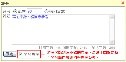 老師若有批改到覺得不錯的作業,也可以於評分時,勾選下方「開放觀摩」,讓學生觀摩參考。
