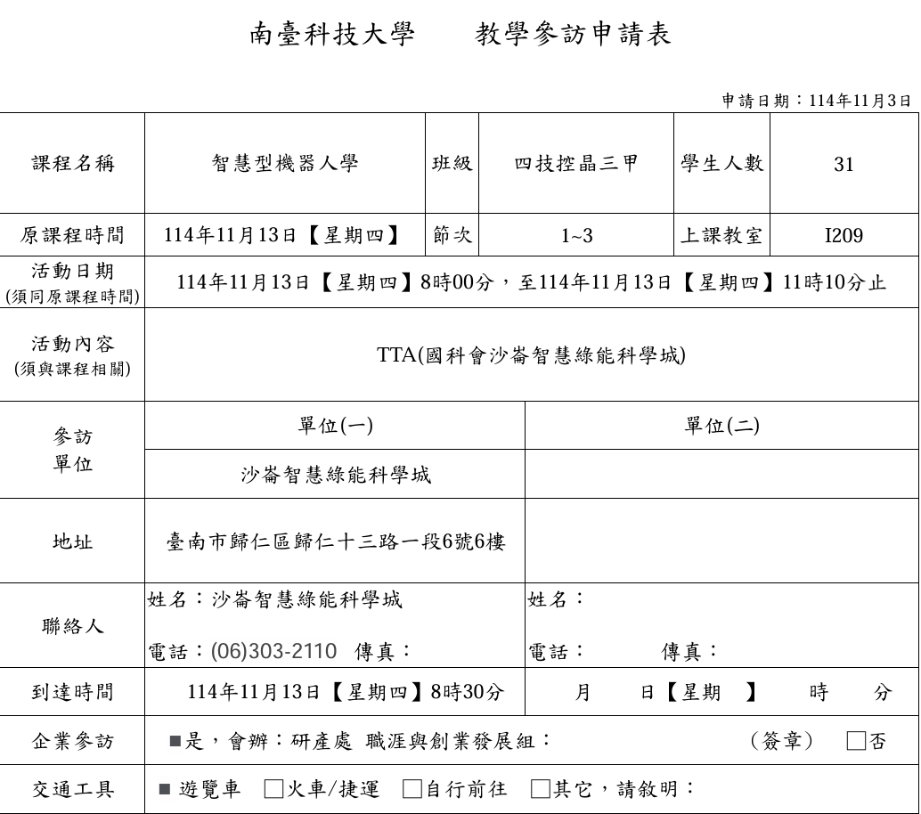114年11月13日智慧型機器人學課程參訪TTA(國科會沙崙智慧綠能科學城)