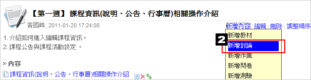 老師可於課程活動中建立討論議題,讓學生針對內容進行意見交流,新增步驟如下: