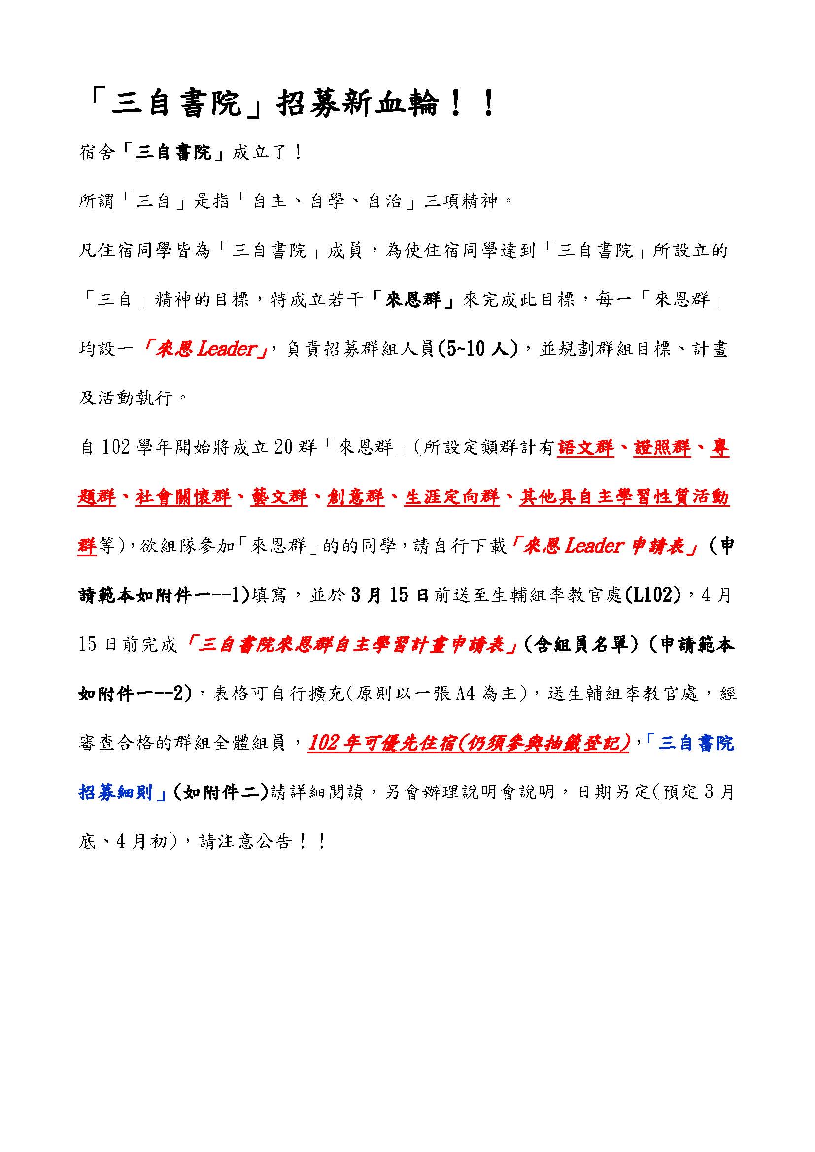 102年可優先住宿(仍須參與抽籤登記),「三自書院招募細則」請詳細閱讀本次公告,