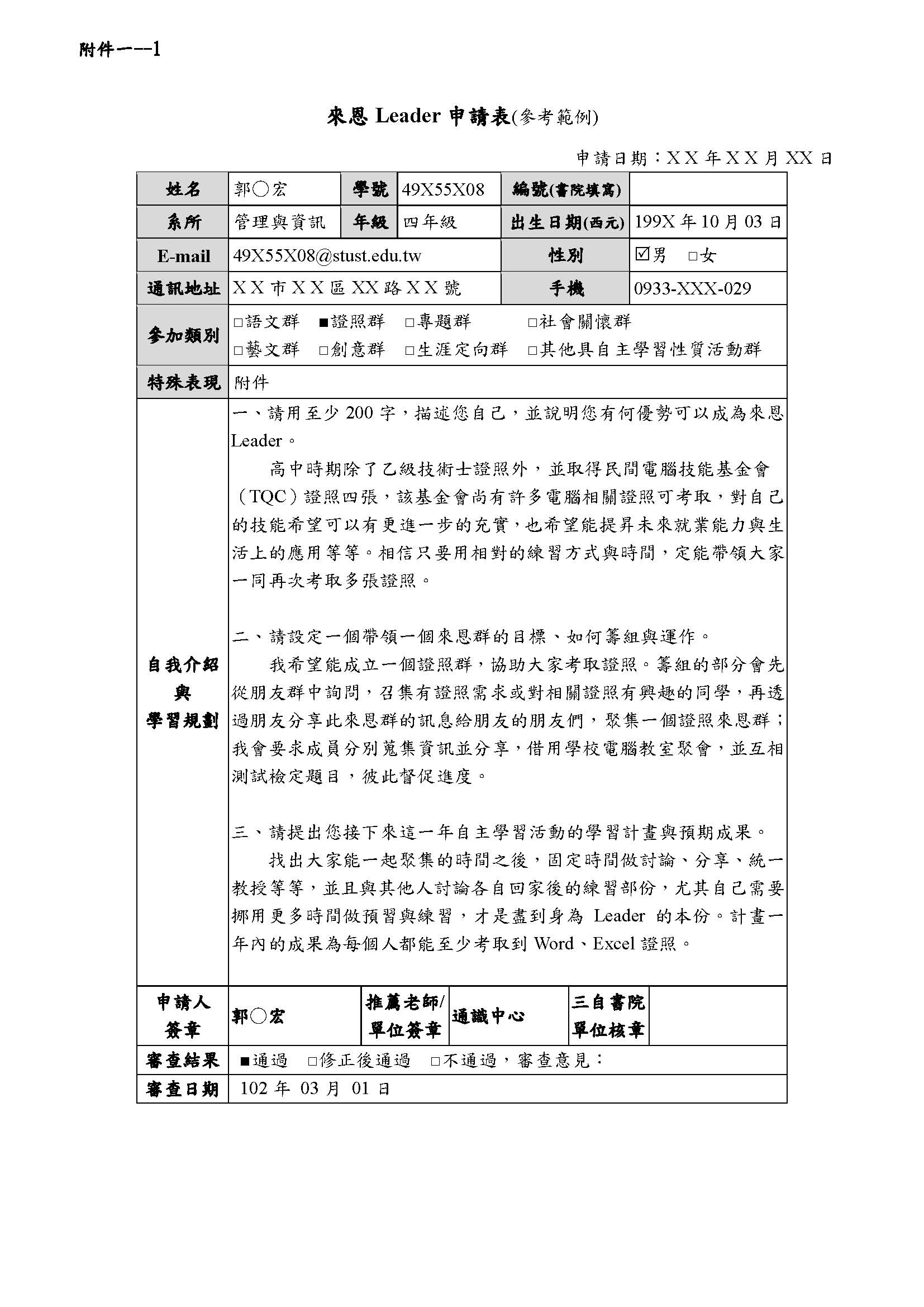 表格可自行擴充(原則以一張A4為主),送生輔組李教官處,經審查合格的群組全體組員,