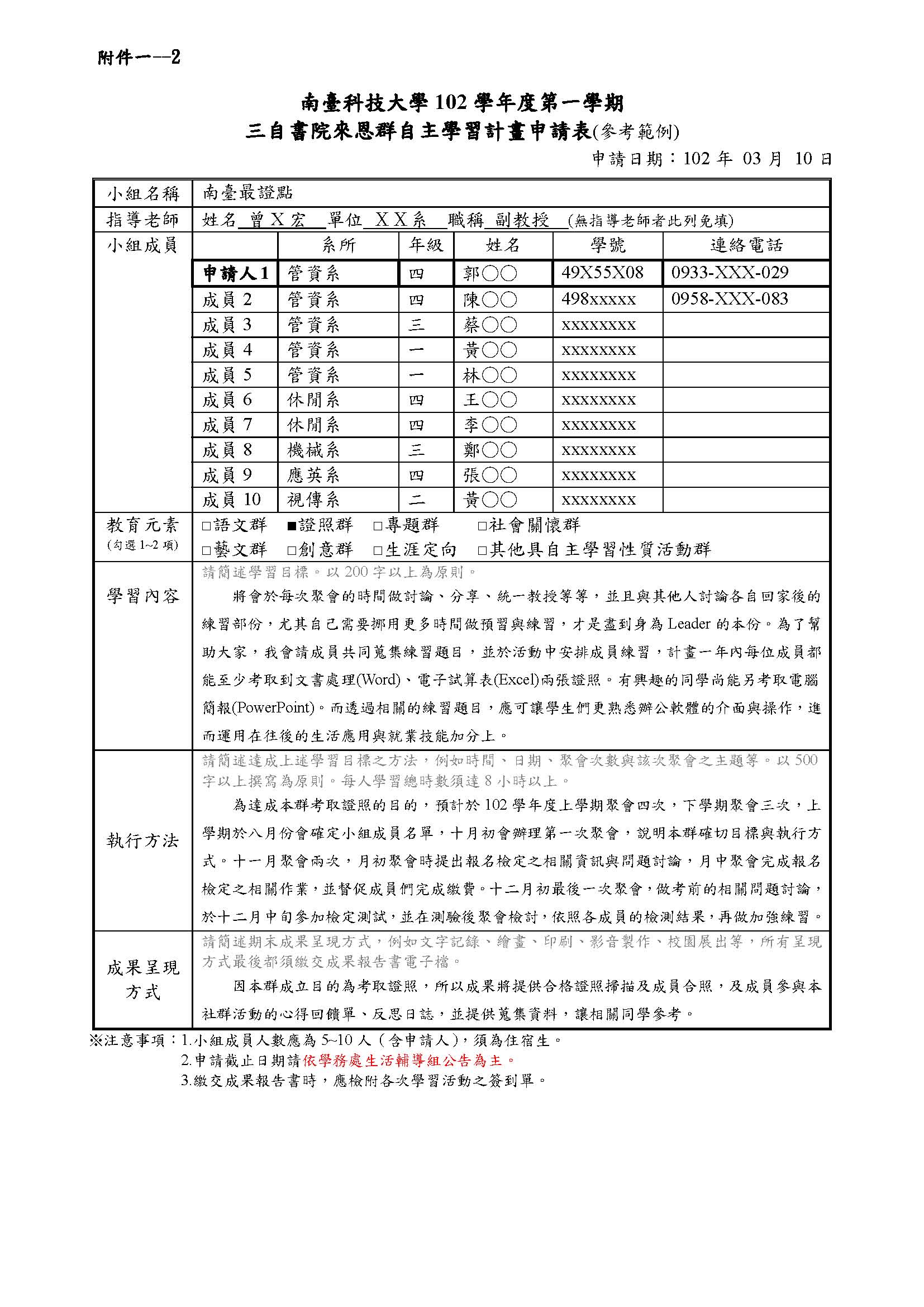 4月15日前完成「三自書院來恩群自主學習計畫申請表」(含組員名單) (申請範本如附件一--2),