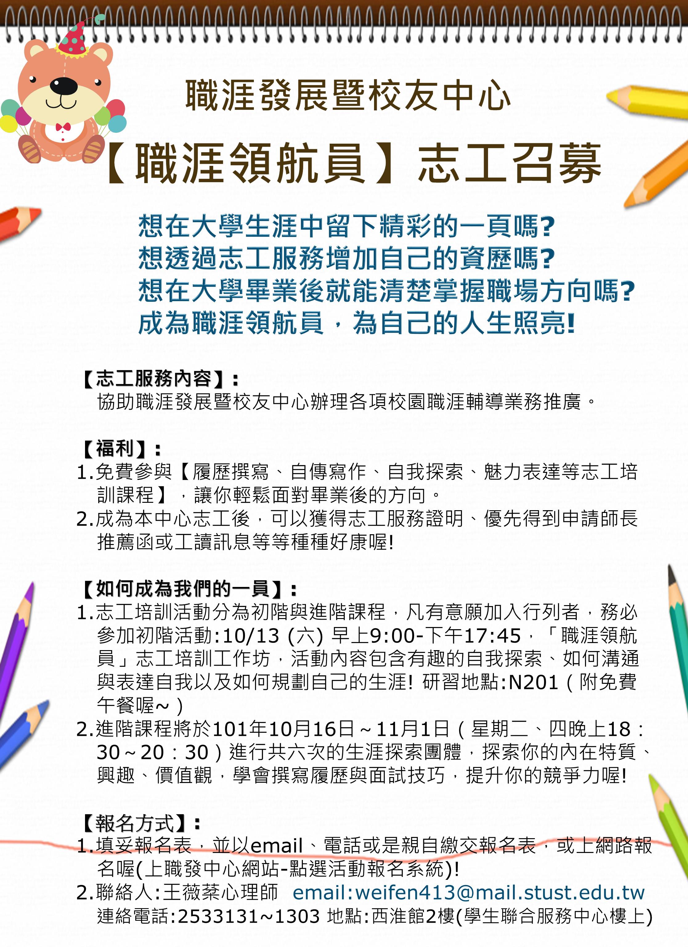即日起,請以線上報名(至職發中心網站,點選上方「活動報名系統」)、或e-mail至weifen413@mail.stust.edu.tw或來電報名(轉校內分機:1300~1306)、或親自至職發中心(西淮館2樓)洽王環莉老師與王薇棻心理師~