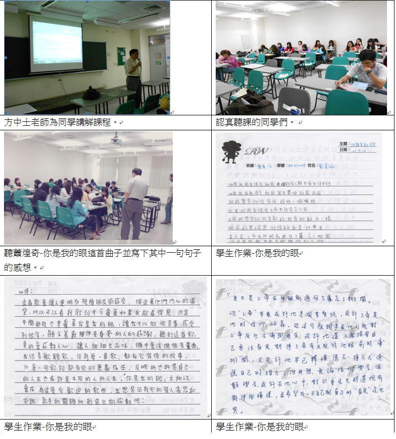 1.第一週老師講解課程要上什麼,並且讓TA自我介紹。之後小組分組。 2.播放蕭煌奇-你是我的眼這首歌曲,讓學生們傾聽並且寫下歌詞,之後再寫出歌詞裡其中一句背後的涵義以及感想。 3.老師講解字與號這篇教材,並請學生仔細想一想如果要為自己命字該怎麼命。 工作省思: 初次當TA有些緊張,希望以後可以跟學弟妹相處的越來越好。在播放你是我的眼這首歌時大家都很用心的聽,看到繳回來的作業可以得知大家都很感動,希望大家可以藉由這堂與以往不一樣的國文課學到更多知識。