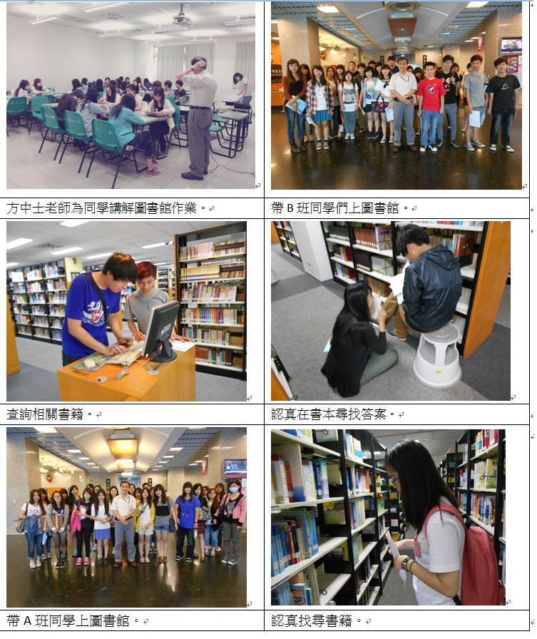 1.第三週實施中文能力檢測。 2.第四週實施圖書館作業,老師設計的學習單一共有30題,在出發至圖書館之前先抽籤,以抽到的號碼對應學習單上面的題目,去圖書館找出答案。 3.老師和TA也在圖書館陪同同學們以便在找資料有困難時來詢問。 工作省思: 雖然圖書館作業看似有點困難,但其實老師的用意是希望各位同學都可以善用圖書館來找到自己想要得到的資料。藉由去圖書館這段期間我也和同學有更多互動覺得很開心,希望同學都有學到如何在圖書館更有效率得找資料。 |