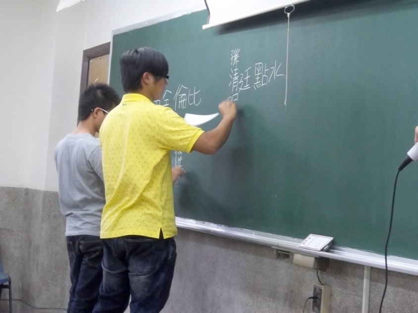 | 2012 / 12 / 6,7 真人圖書館-對於別人的建議與回應做自我修正評估。 | 2012 / 12 / 6,7 請同學上台寫出或畫出虞美人一文的意境。 |