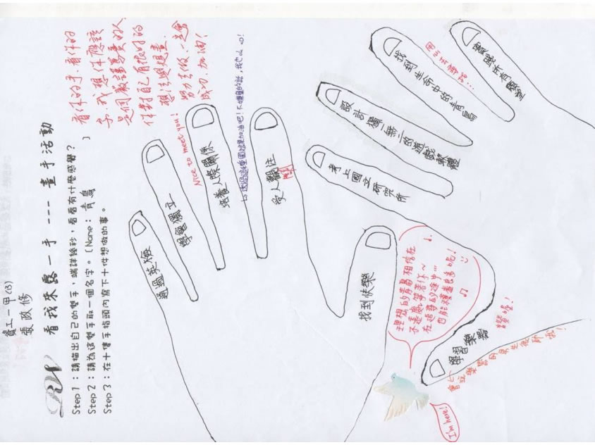 - 「畫手活動」中,學生自由畫出自己的雙手,認識獨一無二的它,並為它取名,再寫出想做的十件事,完成後,學生自行交換認識並給予回饋,最後再由老師與TA給予回饋。