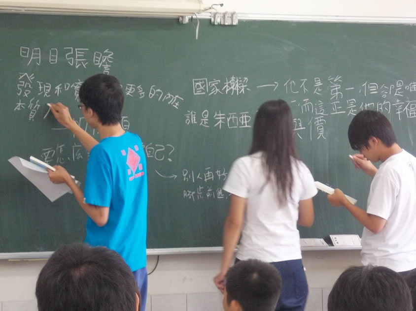 | 2012 / 10 / 11,12上回看完範例後,老師再進一步說明「真人圖書館」的進度與做法。 | 2012 / 10 / 11,12 學生分享各組討論〈天才夢〉文句解讀結果。 |