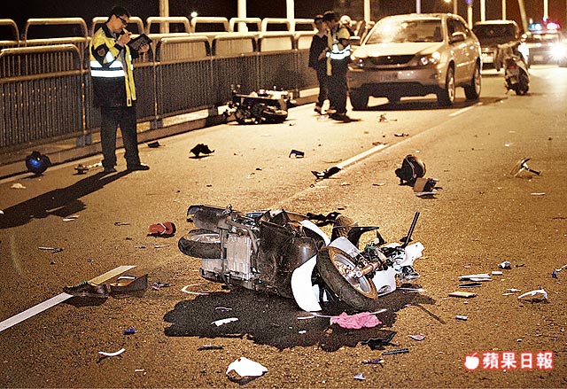 碎片噴散滿布三個車道,肇事女騎士及後座男乘客也摔車重傷,警消急忙將三人送醫,但孝女傷重宣告不治,其父母聞訊相擁痛哭,男友也難過跪地自責不已,姑丈