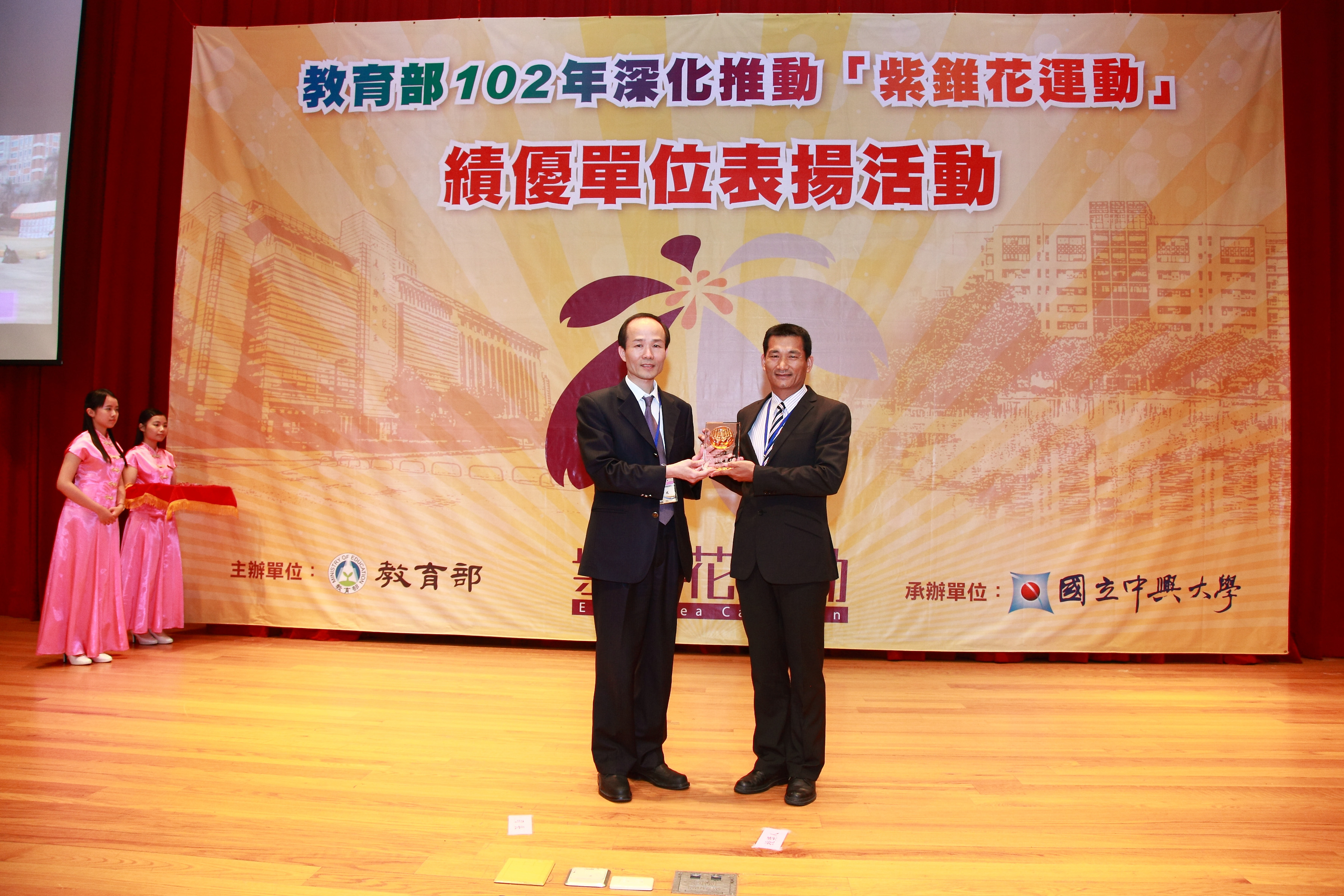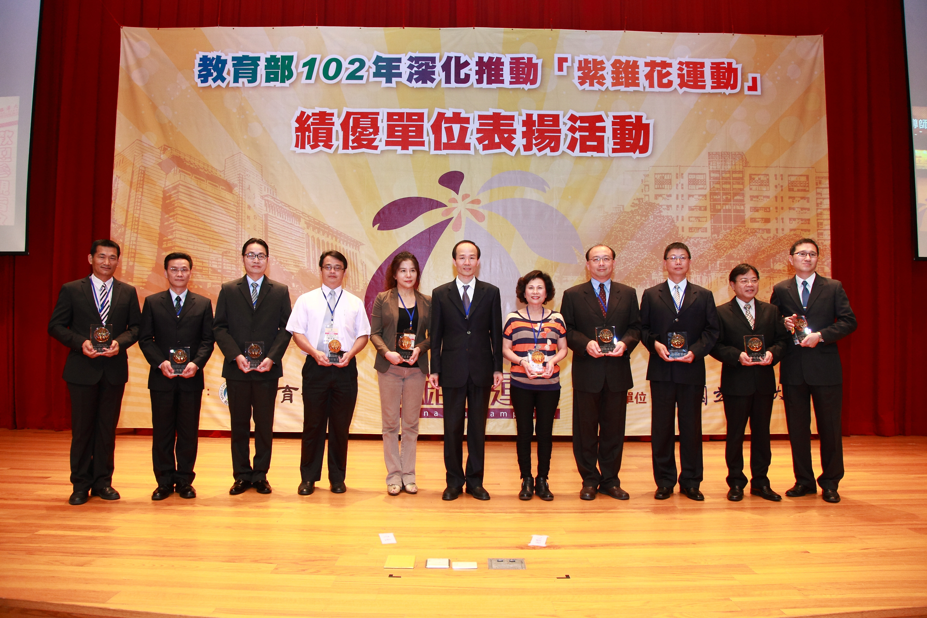 教育部為表彰各級學校積極深化推動「紫錐花運動」,於103年5月5日假國立中興大學國際會議廳辦理102年深化推動「紫錐花運動」績優單位表揚典禮,典禮由學生事務及特殊教育司劉司長仲成主持。典禮首先由中興大學熱舞社,帶來活力四射的反毒舞蹈表演,藉由反毒口號:「拒絕毒害、青春無礙,共創紫錐花校園興世代」,表達勇於拒絕毒品決心。