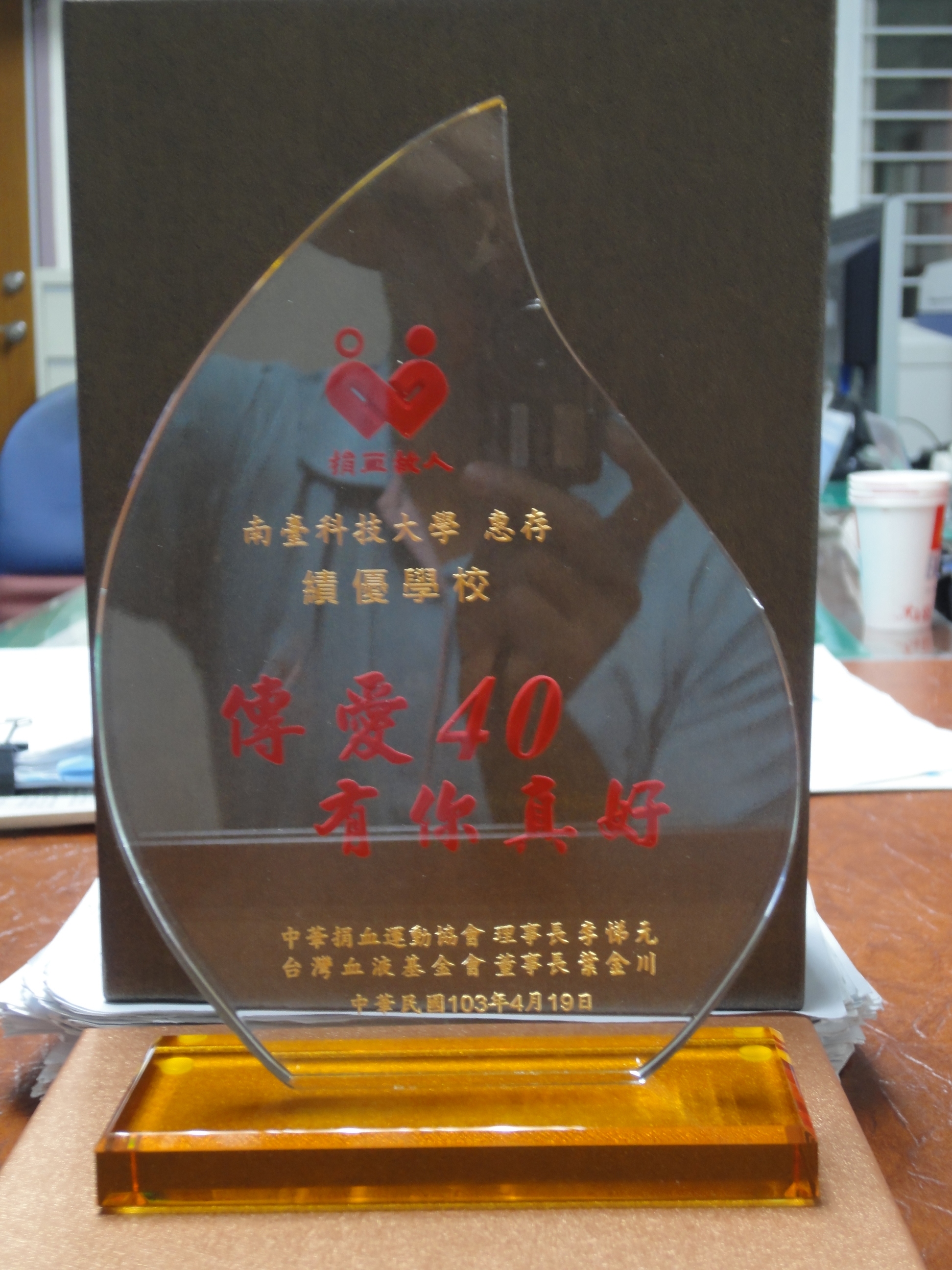 <傳愛40 有你真好>南臺科技大學熱血青年,對於社會公益活動,從不落人後;102年度南臺科技大學教職員工及學生2161人次捐出71萬CC全血(2840袋),獲得雲林、嘉義、台南三縣市大專校院捐血量第一名。雖然不認識你,但是謝謝你,訴說出受血人無限的感恩之情,因為南臺青年捐出的熱血,延續了精采的生命,真正做到<傳愛40 有你真好>。