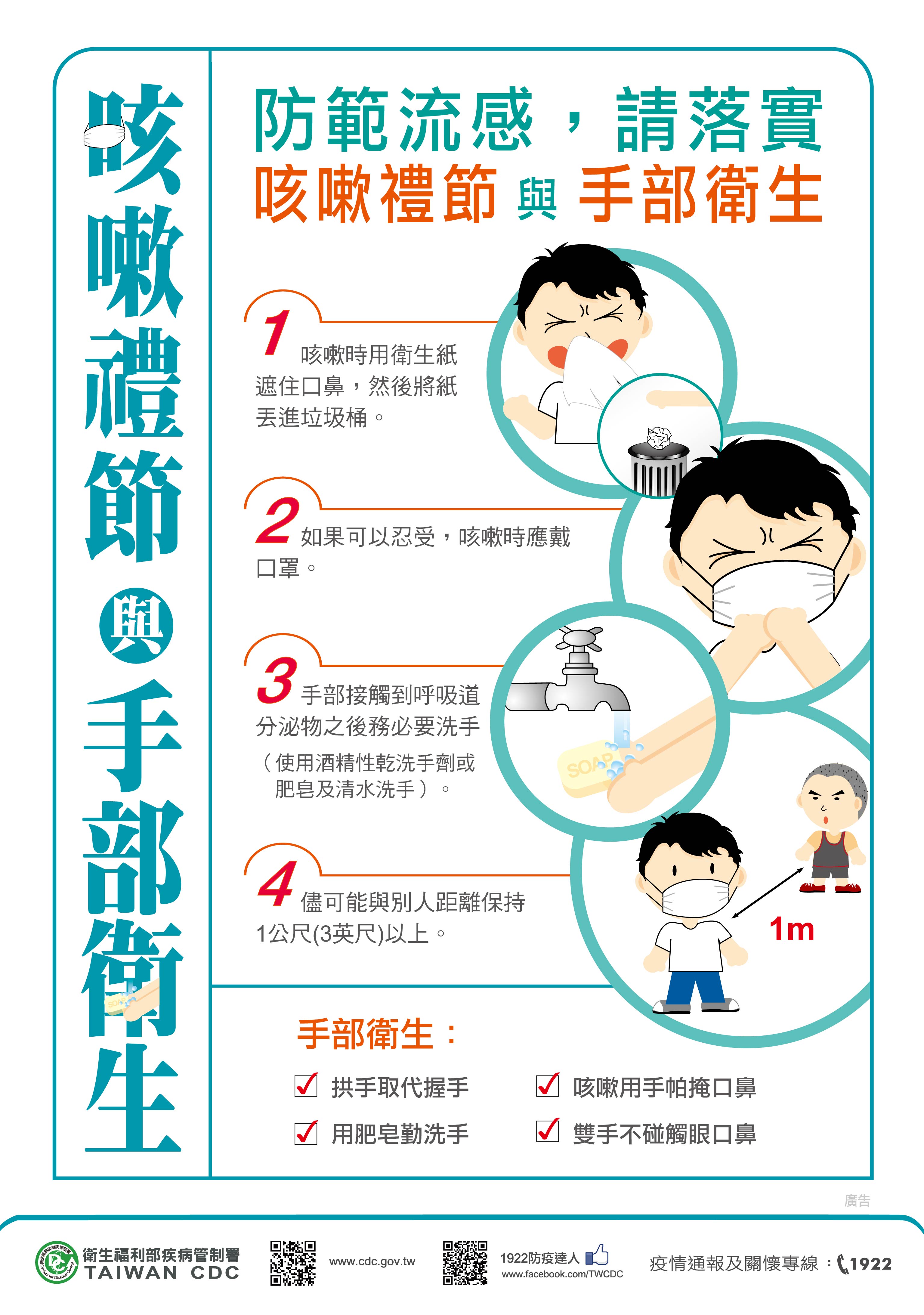 本週大陸冷氣團南下,再次提醒大家,注意保暖外,務必加強手部及呼吸道衛生(如附件),避免出入人潮擁擠、空氣不流通場所,如出現類流感症狀,應戴上口罩儘速就醫,並落實「生病不上班、不上課」原則,在家好好休息,以免擴散疫情,必要時請依醫師指示使用公費流感抗病毒藥劑,並請於痊癒後再上班、上學。
