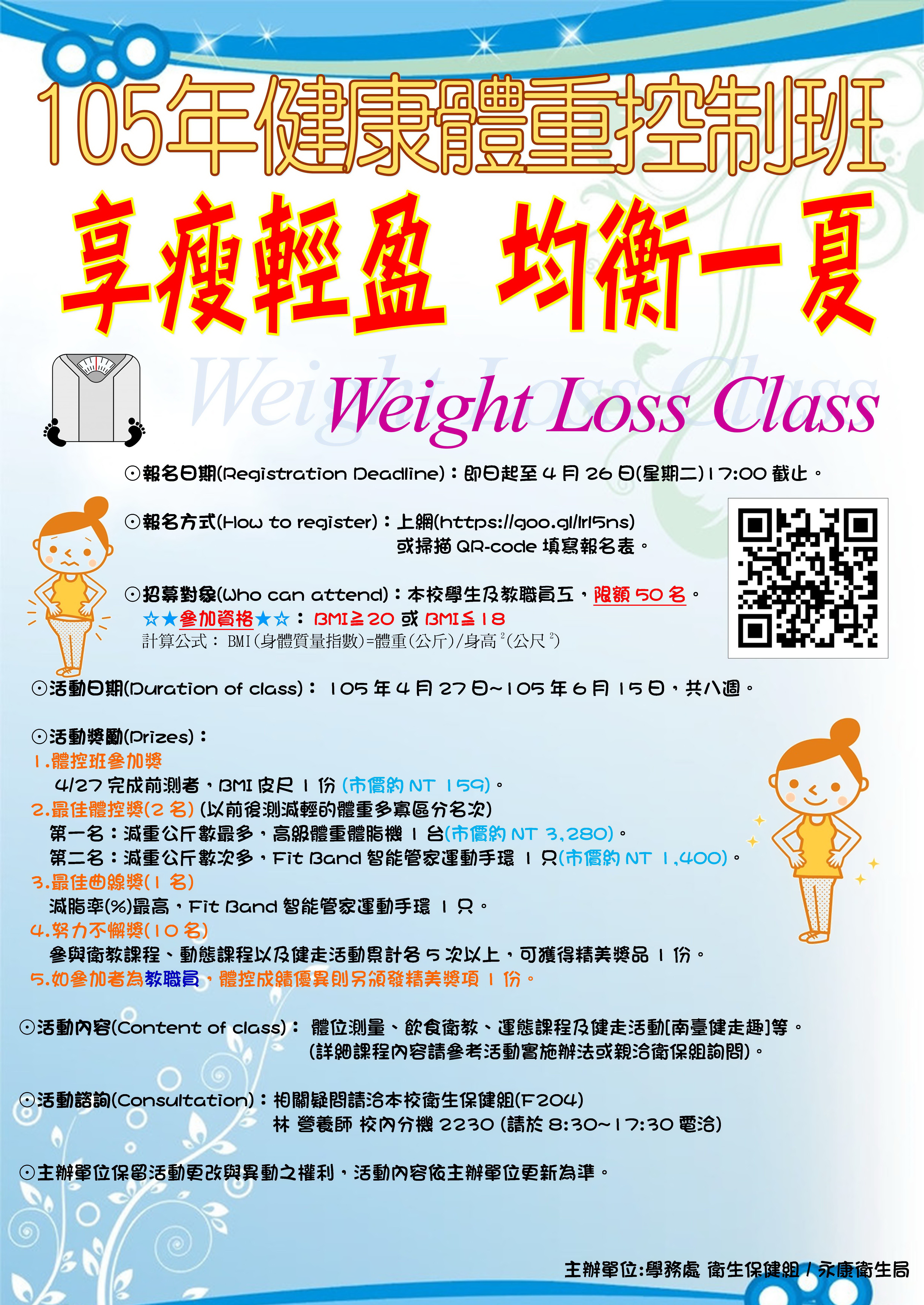 學務處 衛生保健組 辦理「享瘦輕盈,均衡一夏」105年健康體重控制班,開始報名囉!!