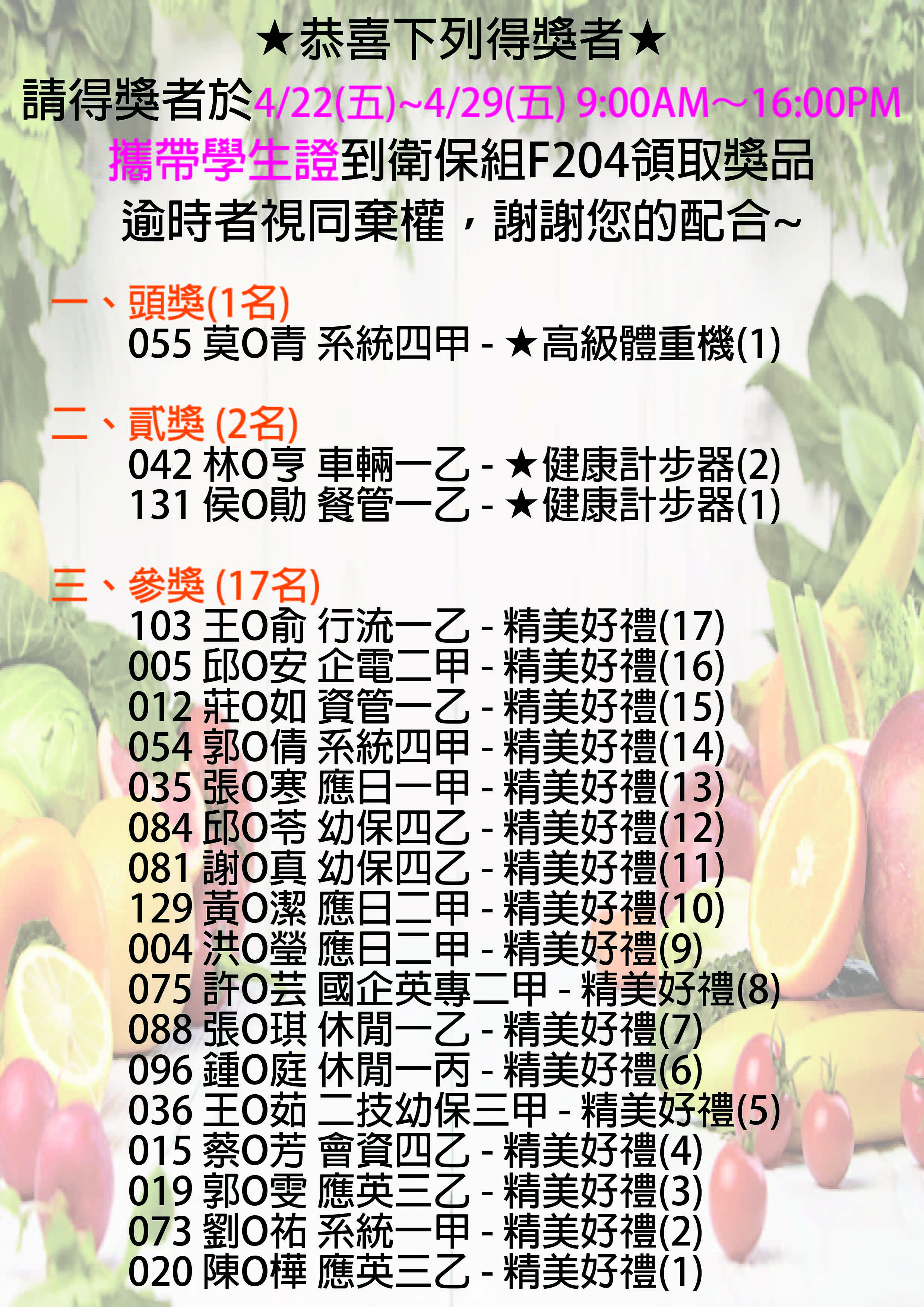 恭喜下列得獎者,請得獎者攜帶學生證於4/22(五)~4/29(五)到衛保組F204領取獎品,逾時者視同放棄,如果同學們看到有自己的同學或朋友為公告之得獎名單~請通知得獎的好友,記得來領獎唷!