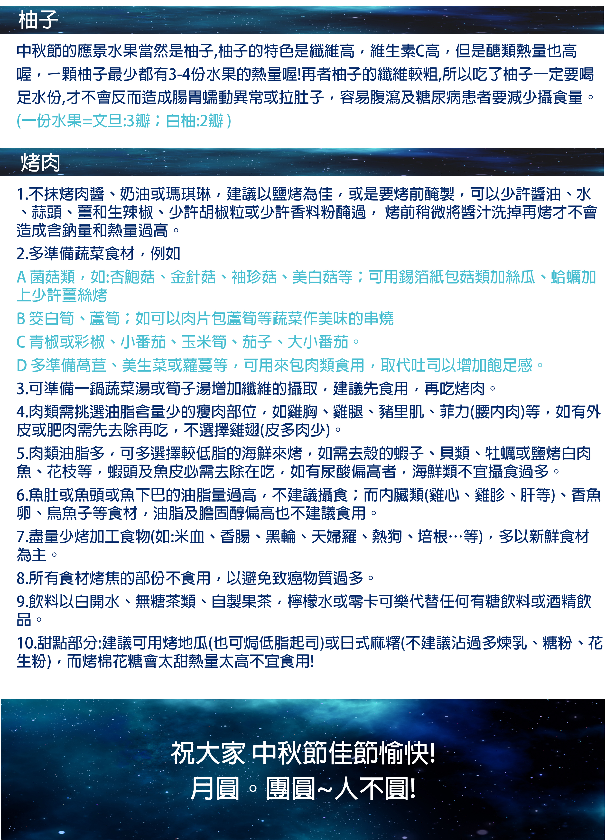 中秋節是台灣人的重要節日之ㄧ,該如何吃的開心又吃的健康,這是很重要和快樂的課題,更不知從幾何時中秋節除了吃月餅和柚子之外,烤肉也是重要的活動之一,烤的食物容易造成蛋白質變質,而且熱量也較高,所以要知道如何應變喔!營養師告訴您如何健康吃~願您月圓。人不圓!中秋節飲食原則,供大家參考!