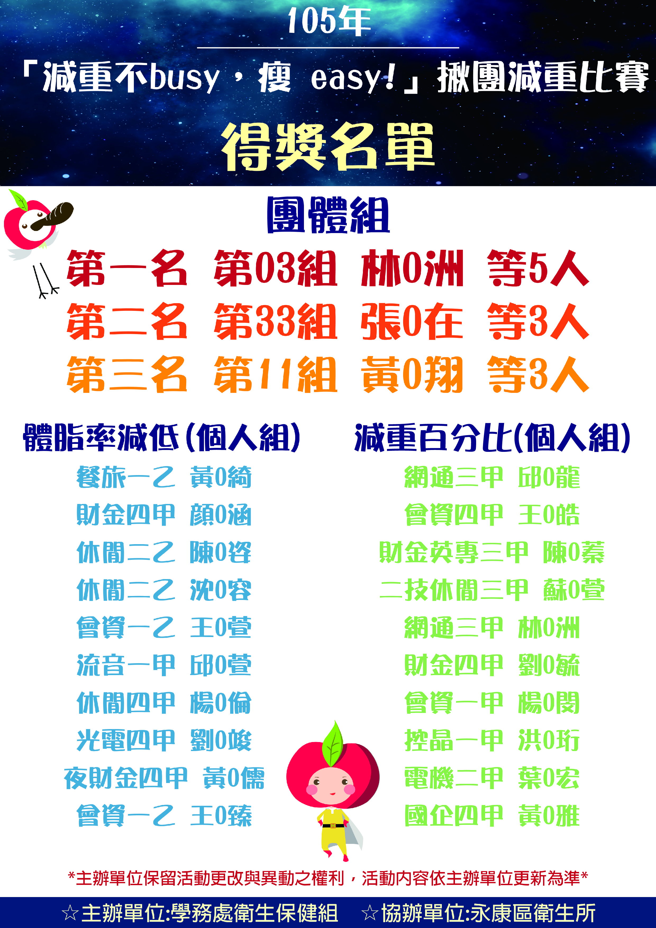 衛保組辦理105年「減重不busy ,瘦 easy!」,揪團減重比賽,得獎名單出爐囉!~
